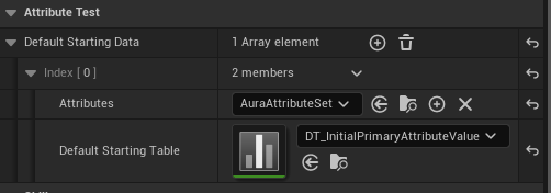 然后就是编辑器上对ASC的操作,需要选中目标Actor的ASC,在Attribute Test -> Default Starting Data中添加属性集和它对应的Data Table: