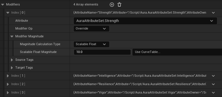 例如在Aura项目中,首先定义用于初始化主角Aura首要属性的GEGE_AuraPrimaryAttributes,它通过Modifier初始化主角的4个属性: